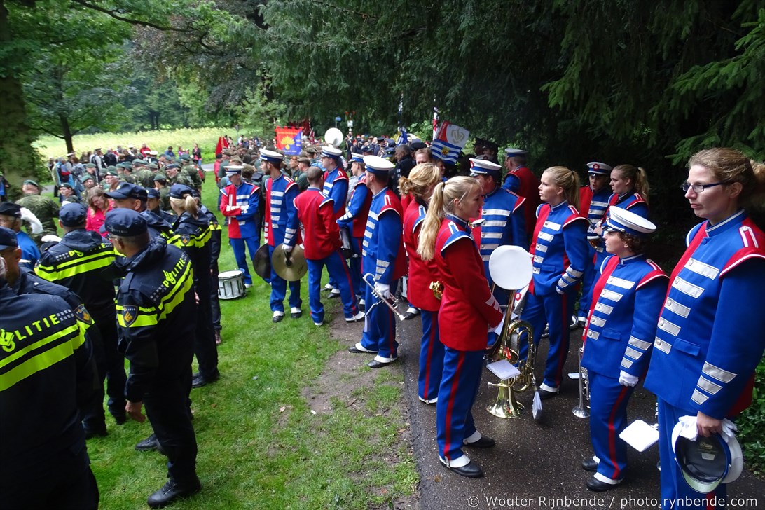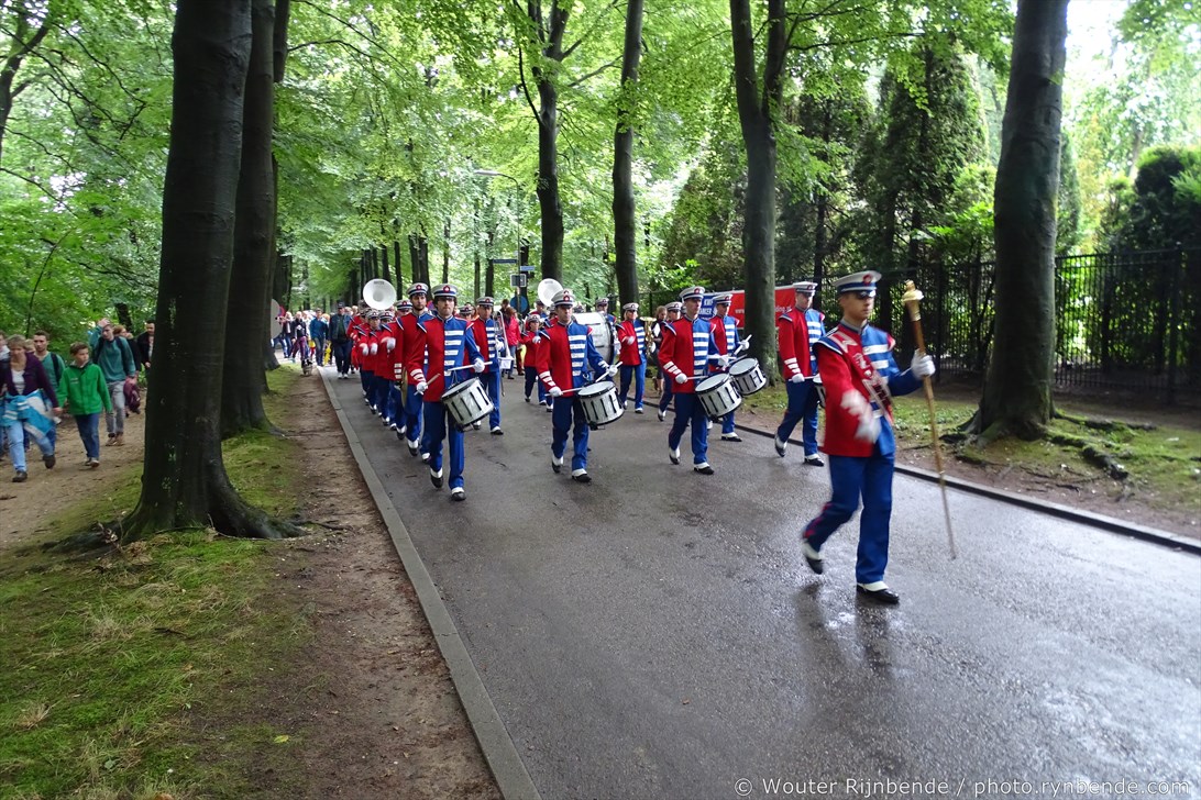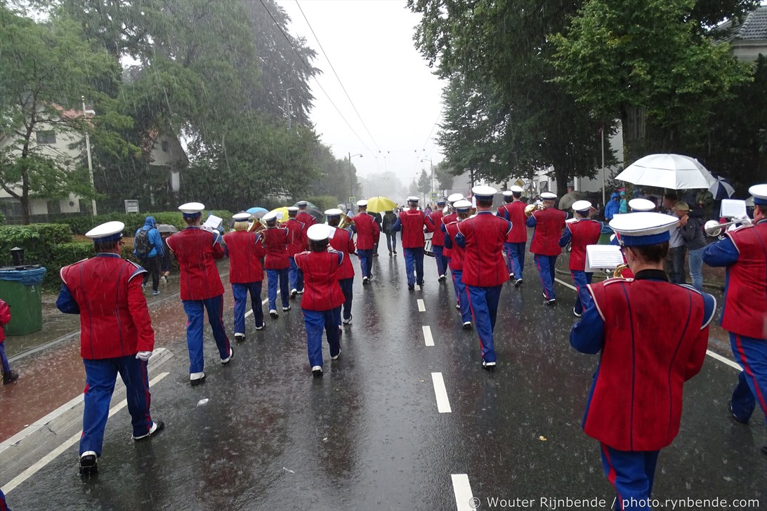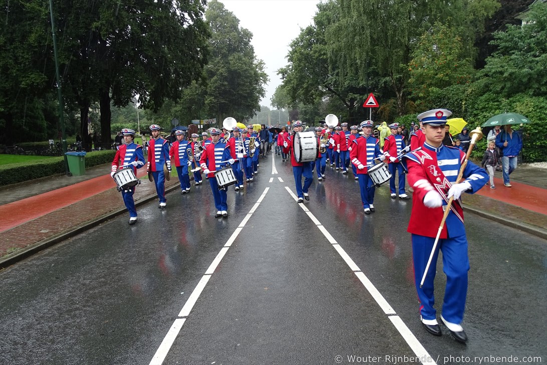 5 september 2015 - Veel regen vandaag tijdens de 69e Airborne Wandeltocht in Oosterbeek. Een nat pak weerhield de March en Showband Rheden er niet van om alle wandelaars te begeleiden bij hun vertrek langs het defilé, en 's middags bij de intocht.