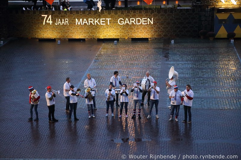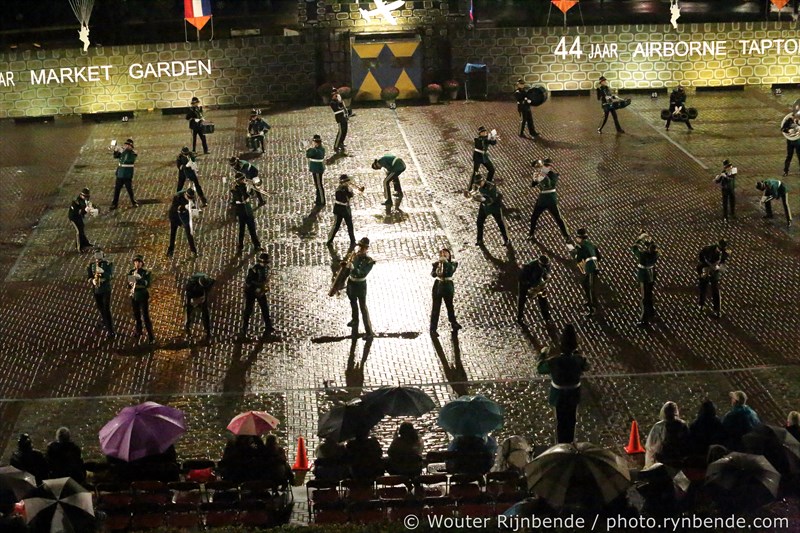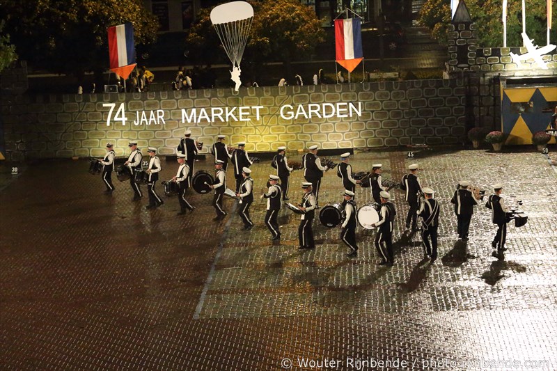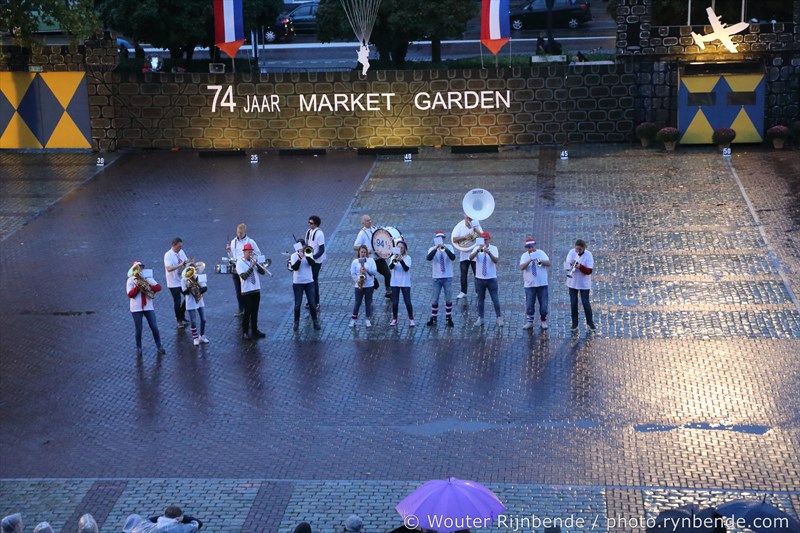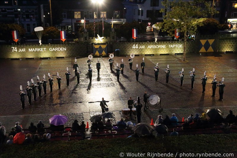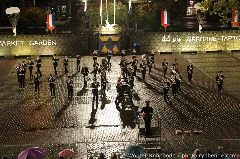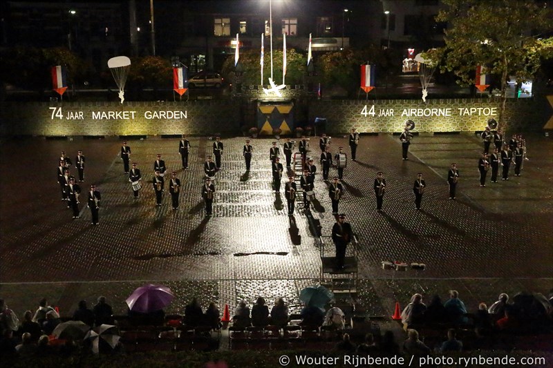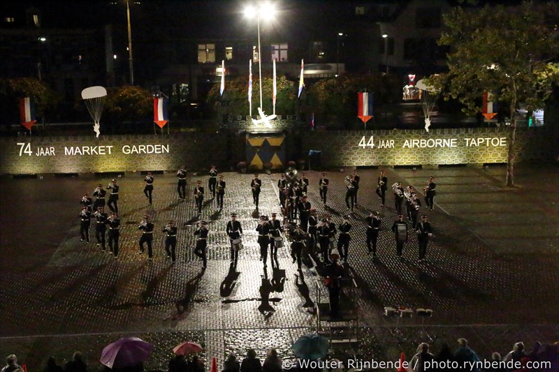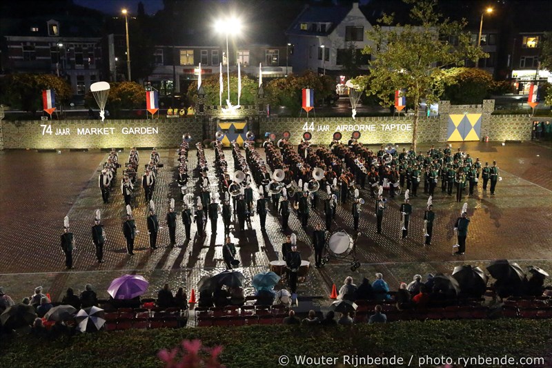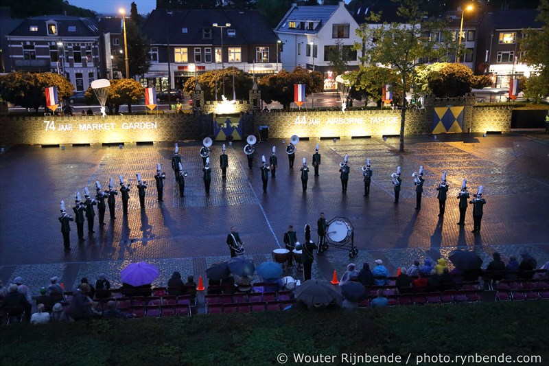 22 september 2018 - Foto's van de 44e Editie van Airborne Taptoe Oosterbeek. Dweilorkest 94½ warmde het publiek op in het voorprogramma van deze regenachtige Taptoe. Daarna konden de bezoekers genieten van optredens van Showband KDO uit Groessen, Excelsior uit Renkum, de Airborne Malletband uit Oosterbeek, het Vrijwillig Fanfarekorps der Genie uit Vught en Exempel uit Empel.