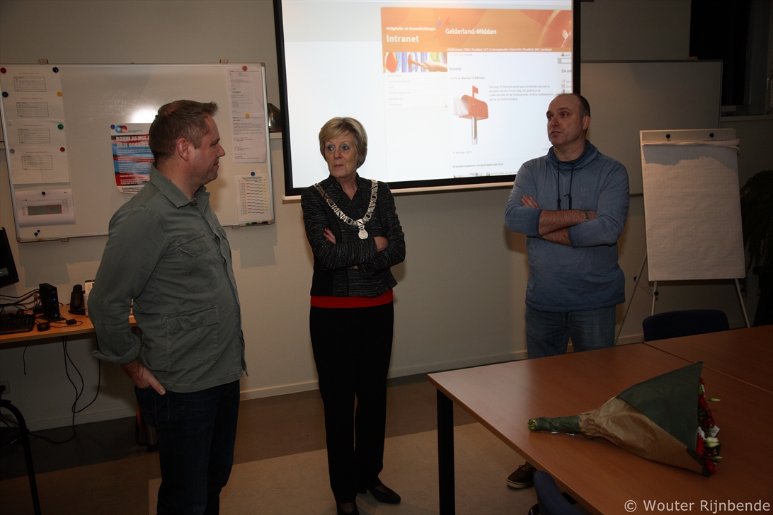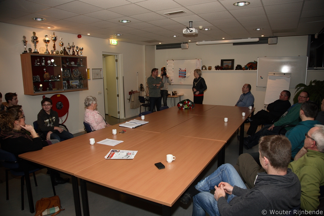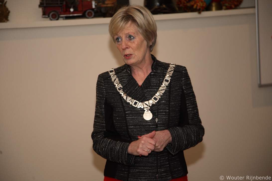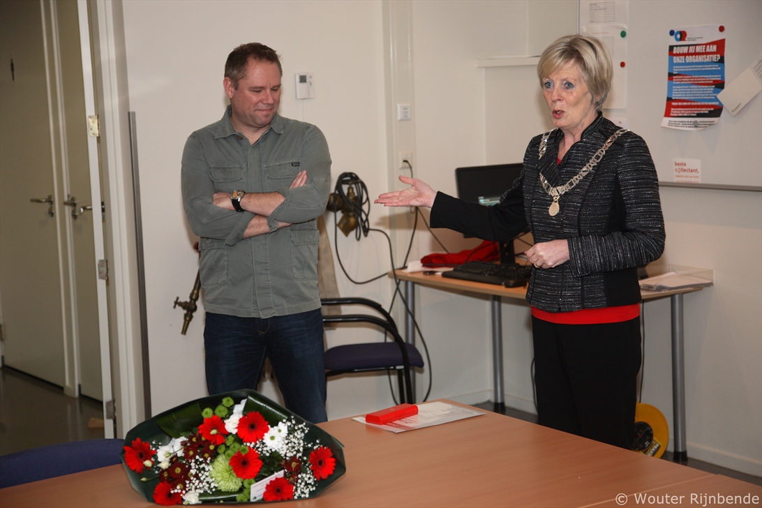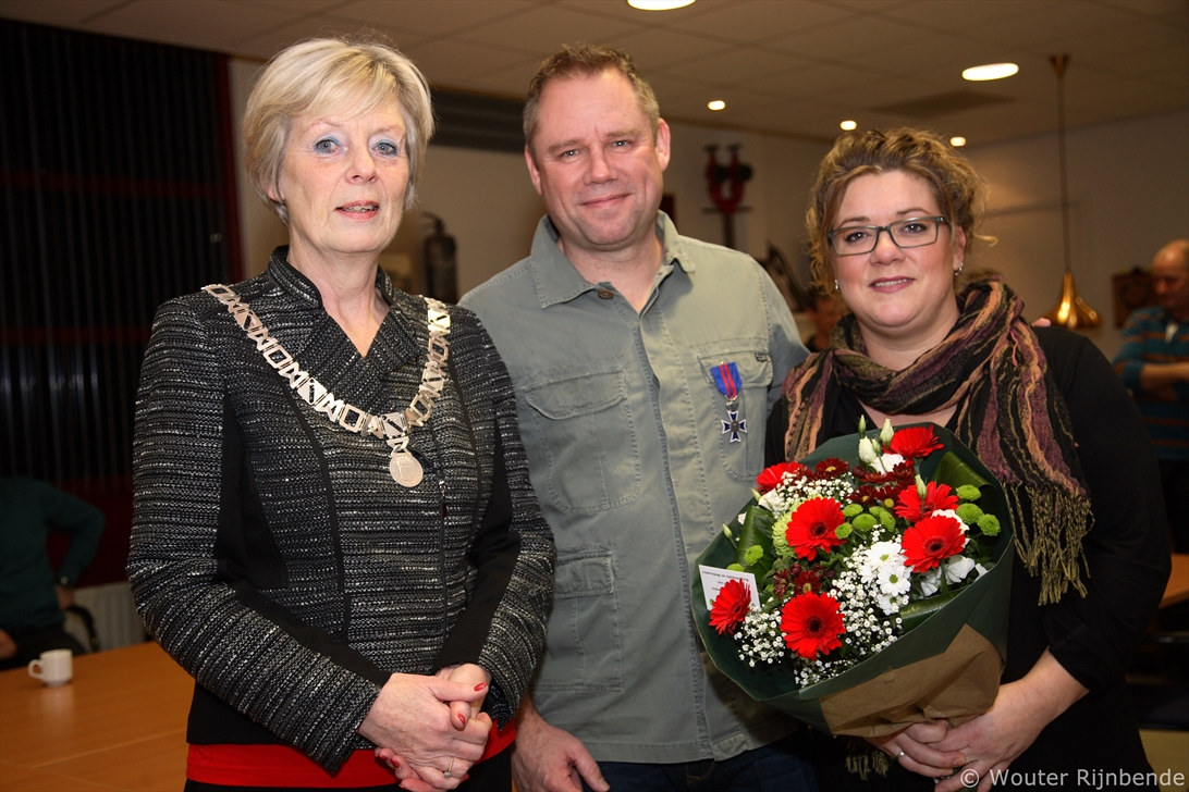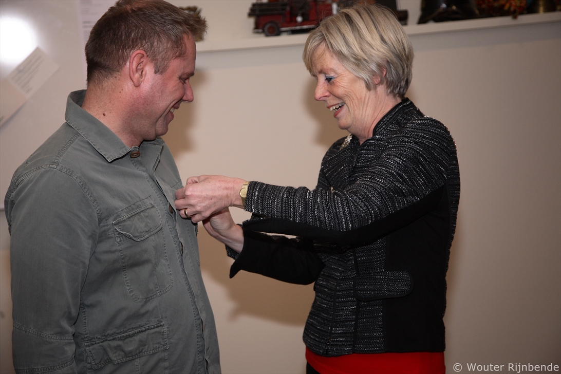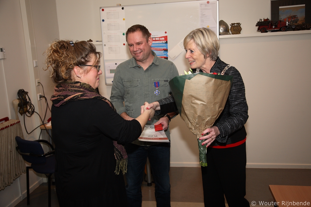 10 februari 2015 - Burgemeester Petra van Wingerden-Boers rijkt een onderscheiding uit aan Bas Koenen voor zijn 25 jarig jubileum bij de brandweer.
