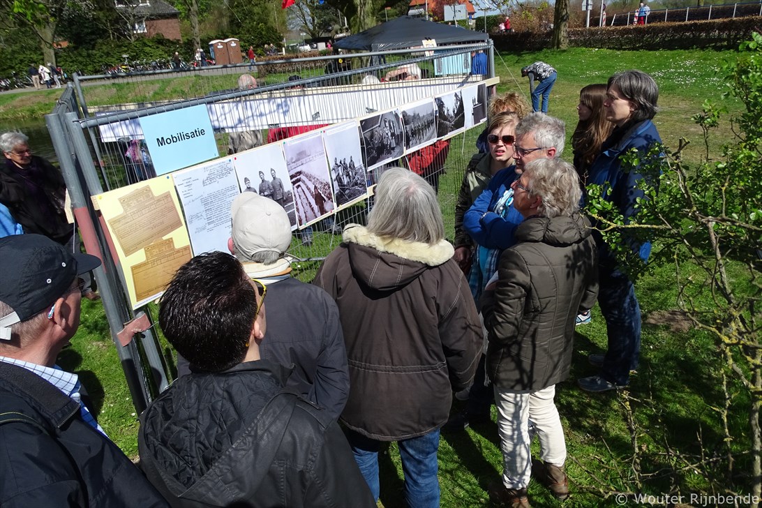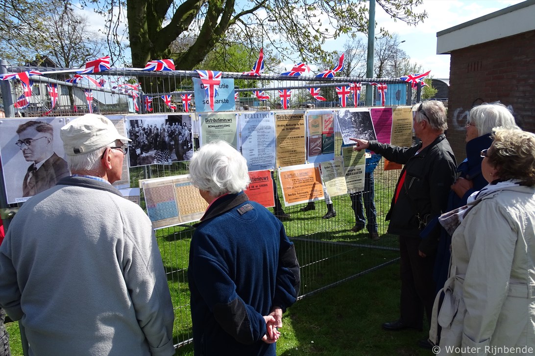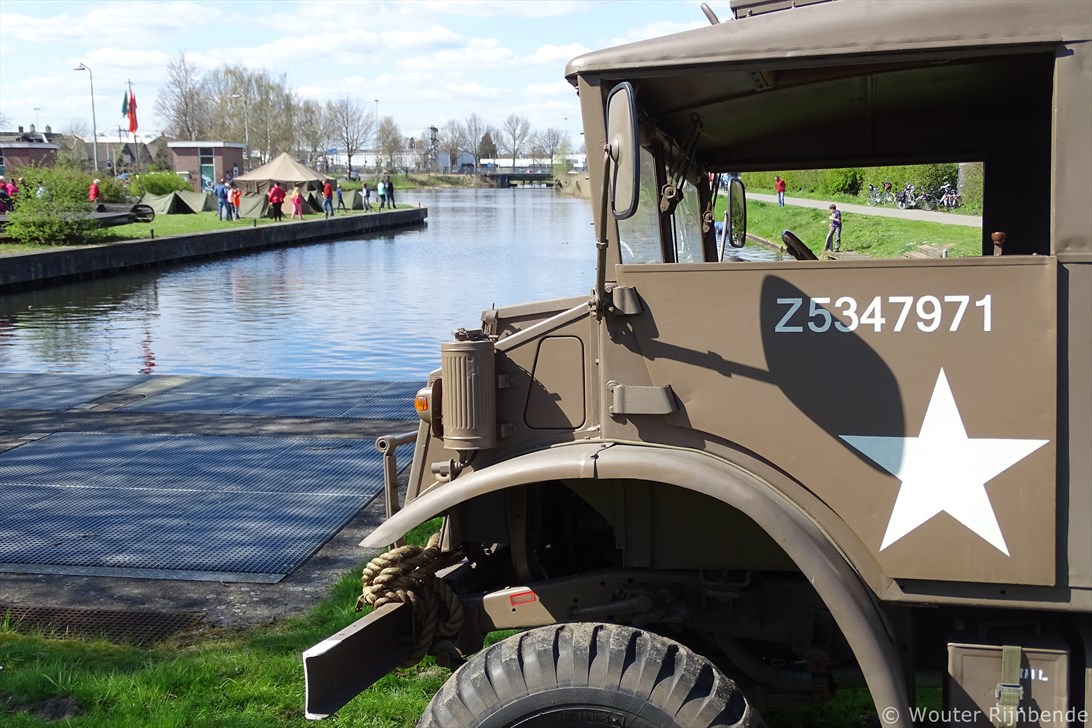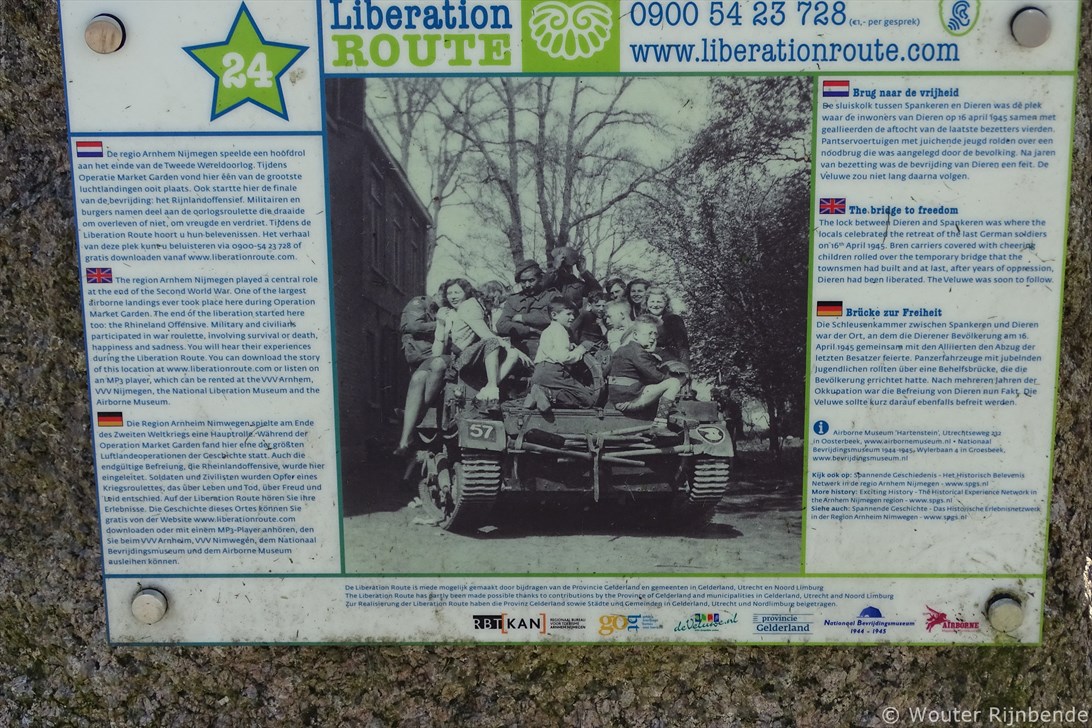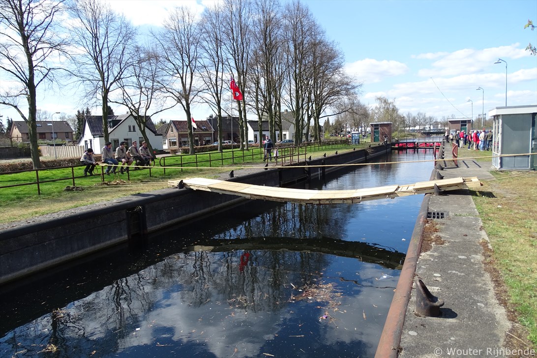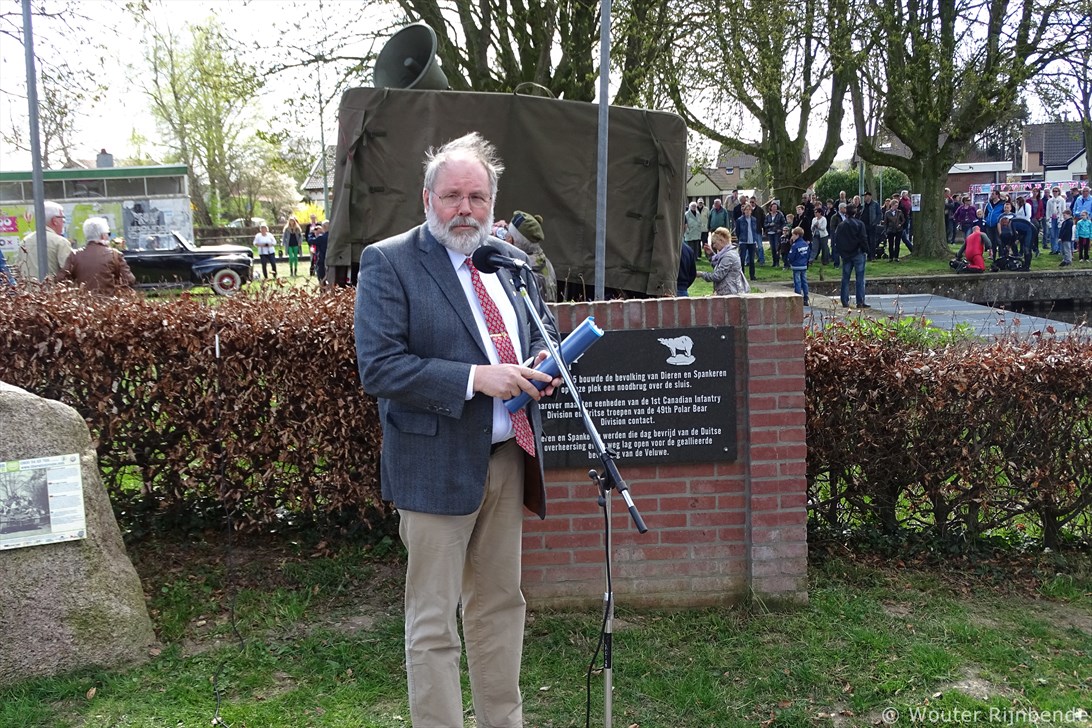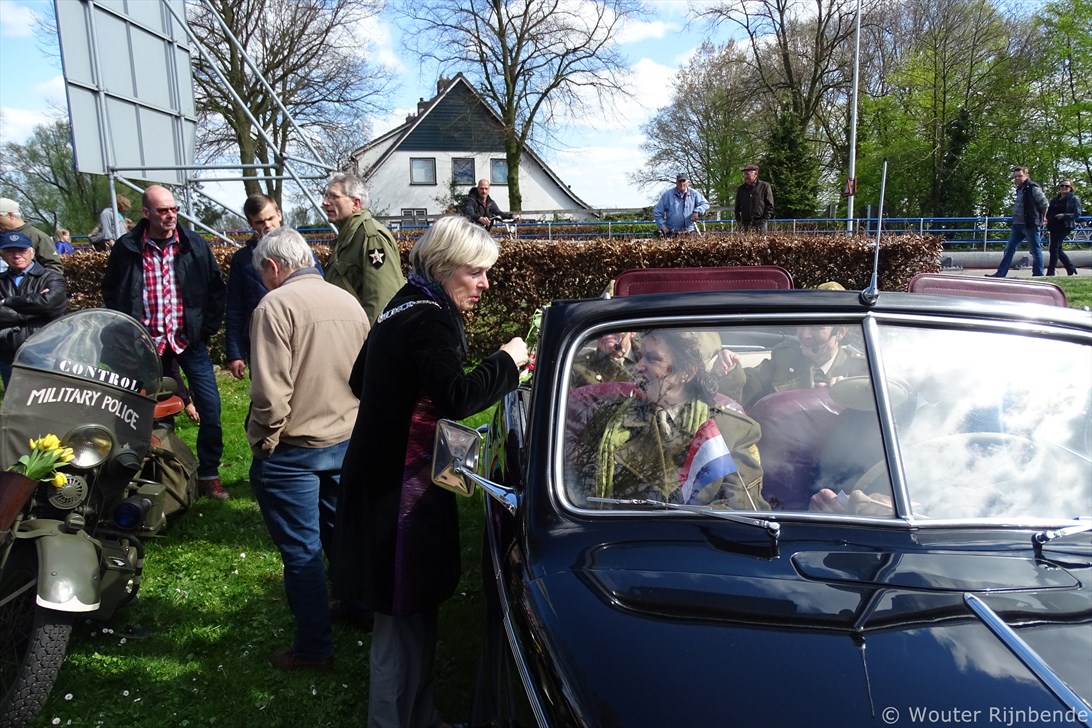 18 april 2015 - Bevrijdingsoptocht komt aan bij de sluis in Dieren. Burgemeester Petra van Wingerden-Boers en wethouder Tjebbe Vugts onthulden een bevrijdingsbank bij de sluis van Dieren.