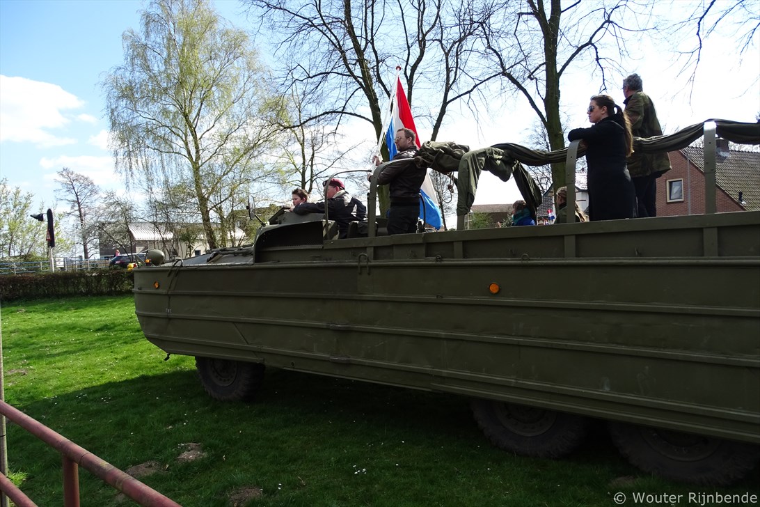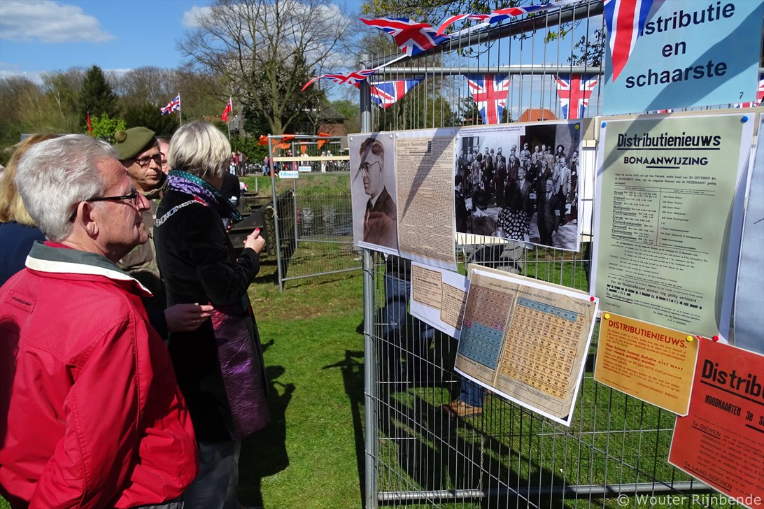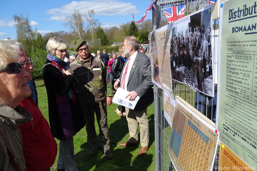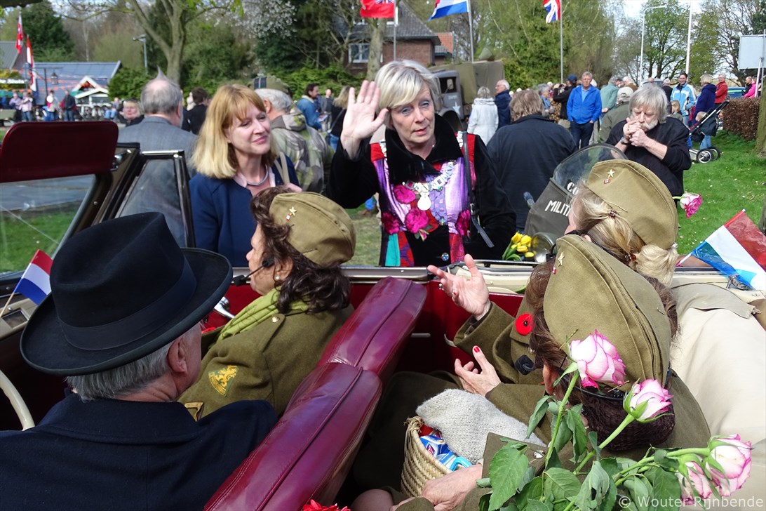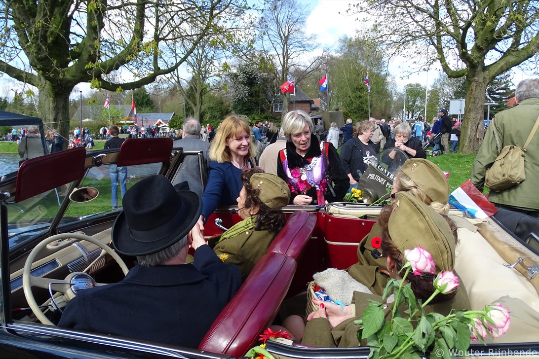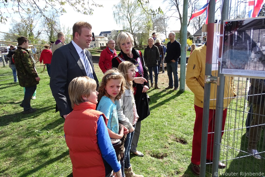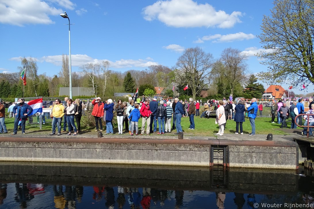 18 april 2015 - Bevrijdingsoptocht komt aan bij de sluis in Dieren. Burgemeester Petra van Wingerden-Boers en wethouder Tjebbe Vugts onthulden een bevrijdingsbank bij de sluis van Dieren.
