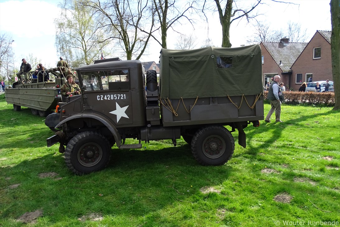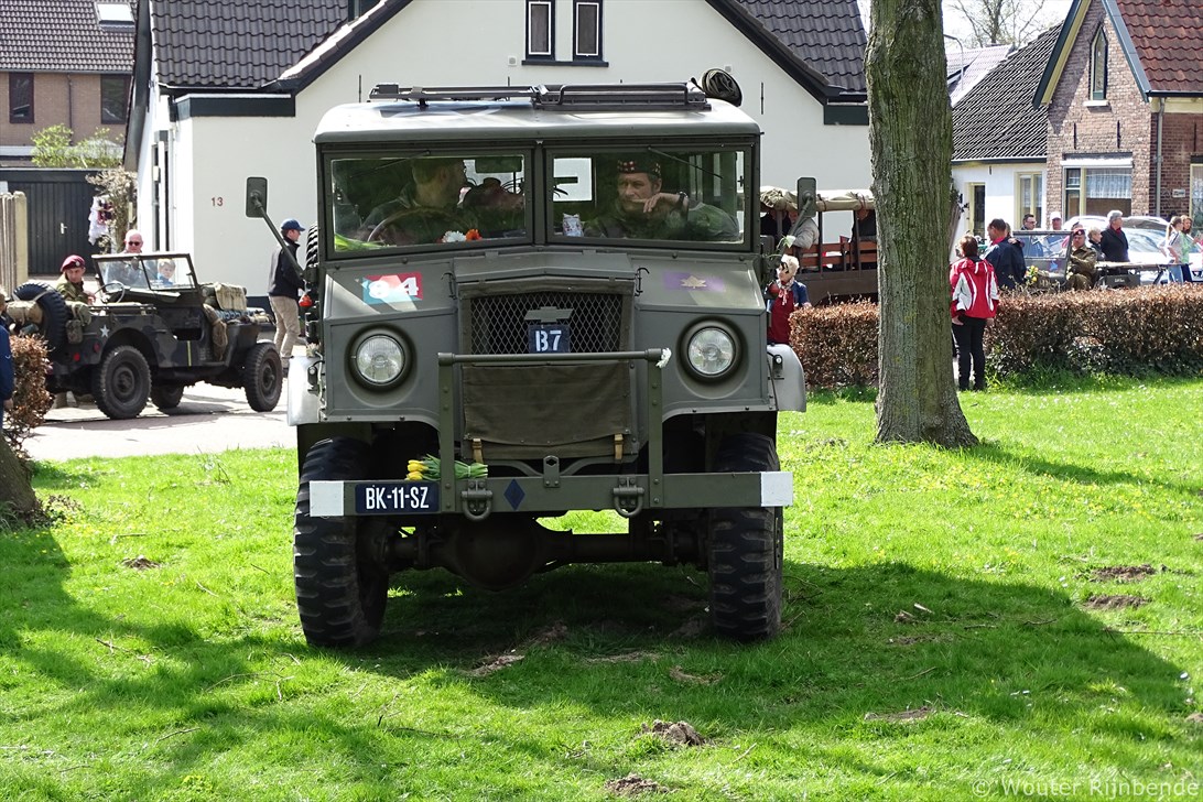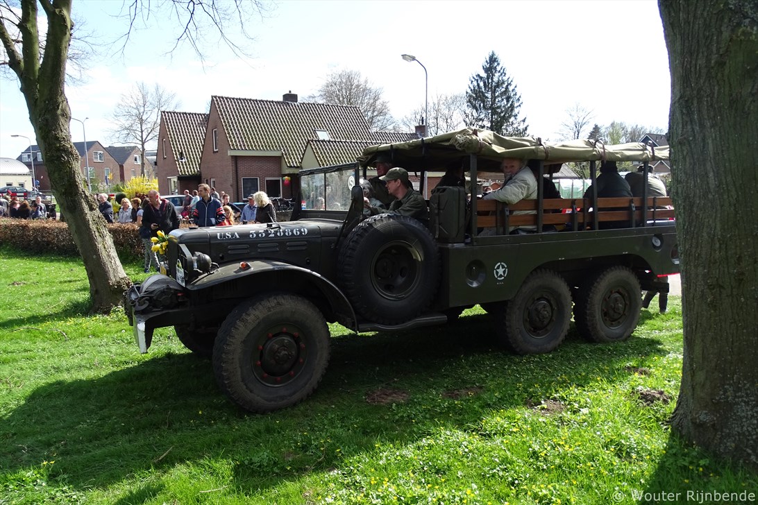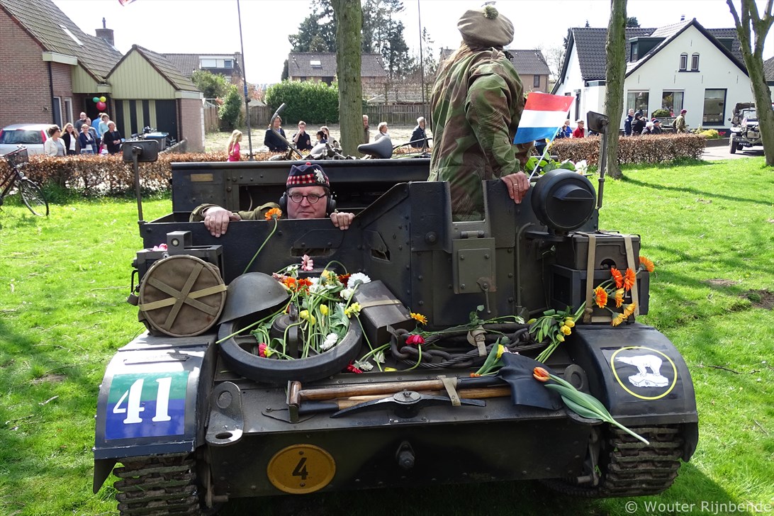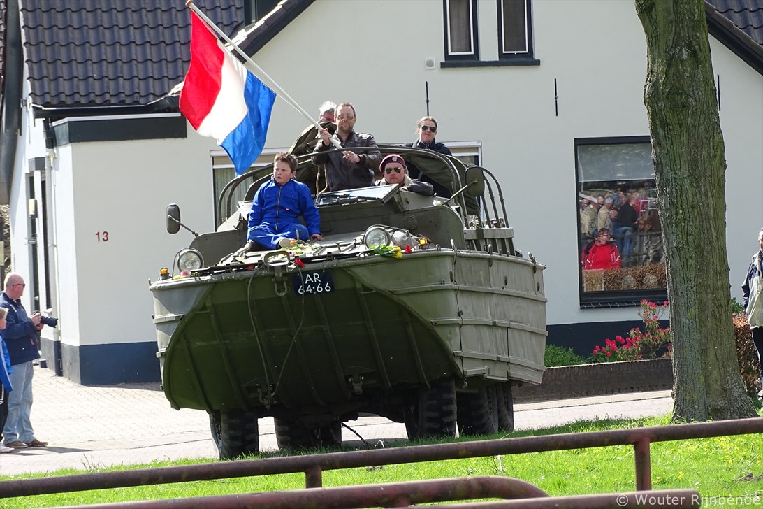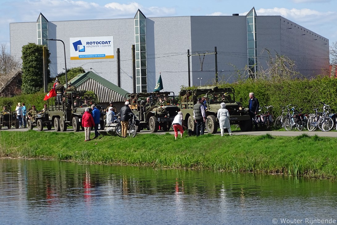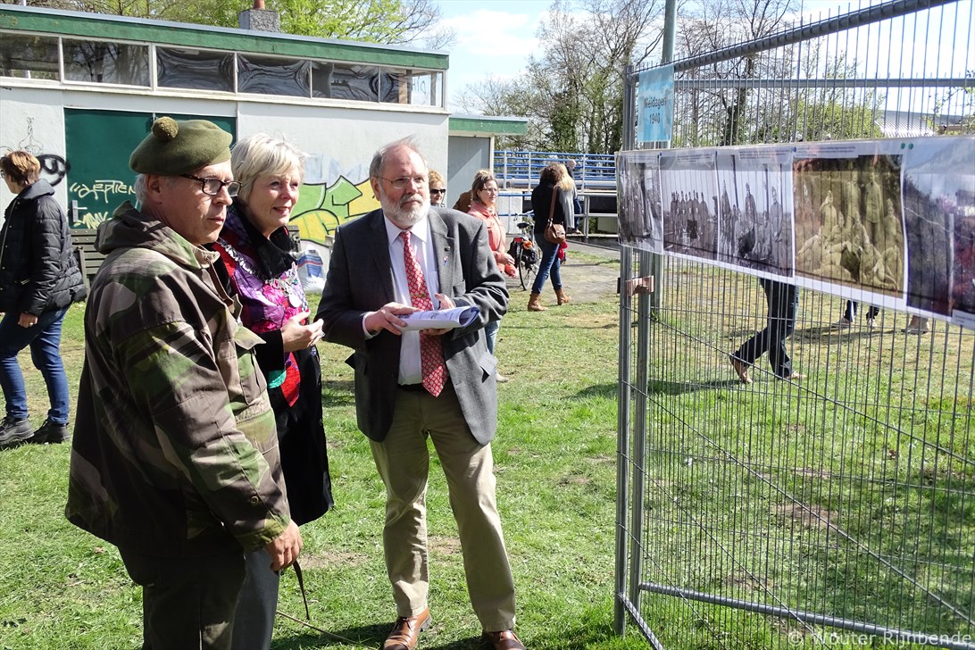 18 april 2015 - Bevrijdingsoptocht komt aan bij de sluis in Dieren. Burgemeester Petra van Wingerden-Boers en wethouder Tjebbe Vugts onthulden een bevrijdingsbank bij de sluis van Dieren.