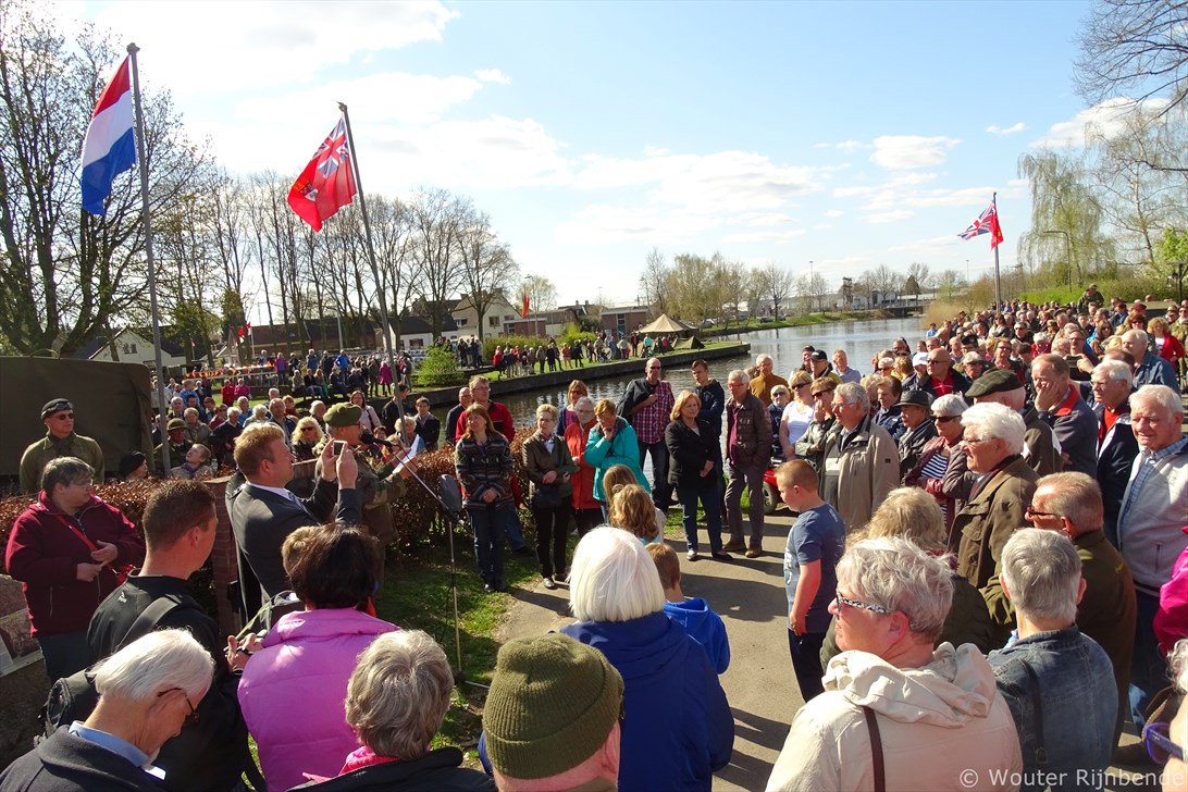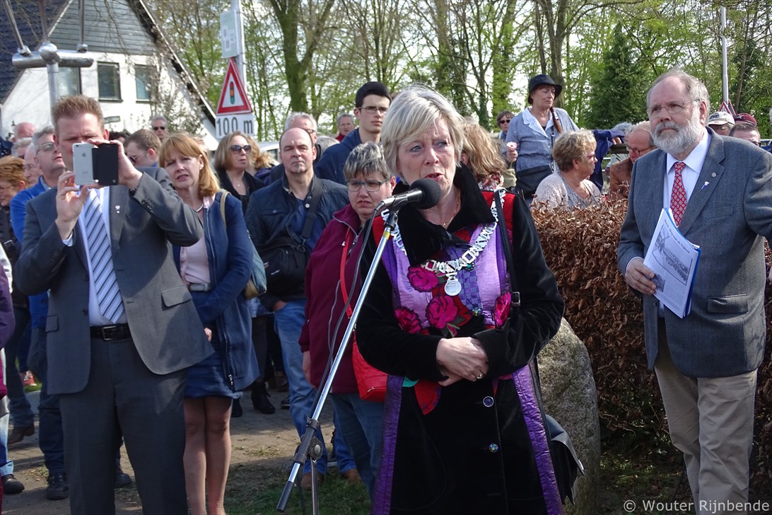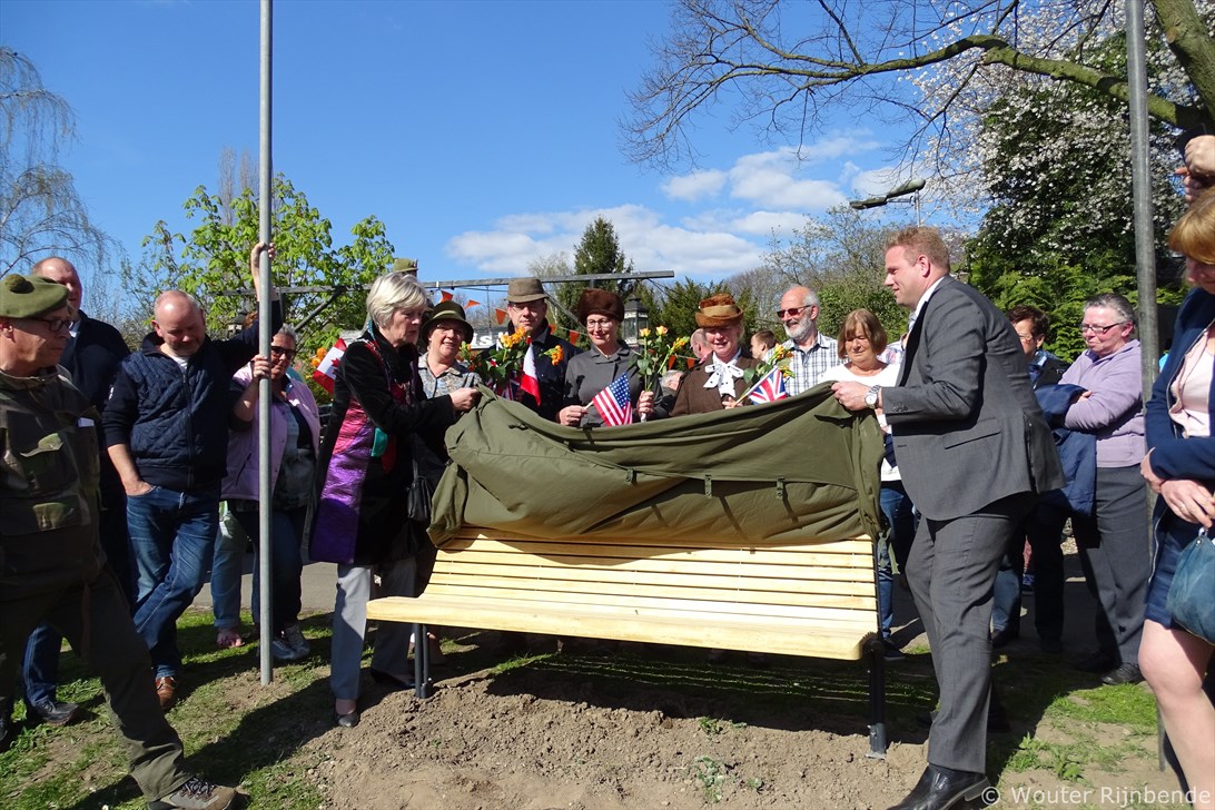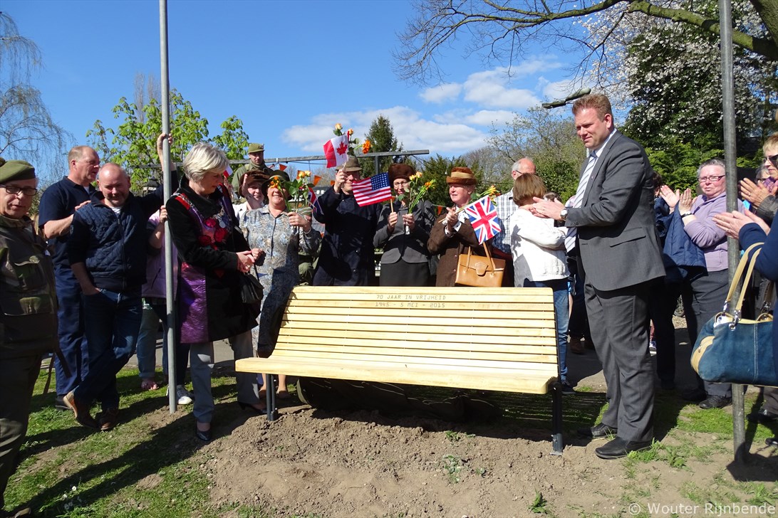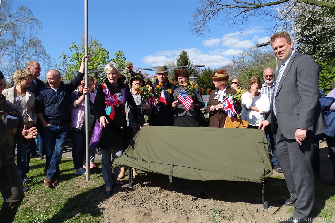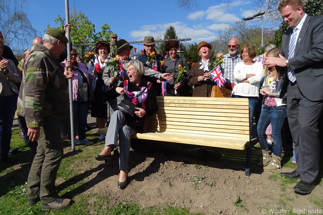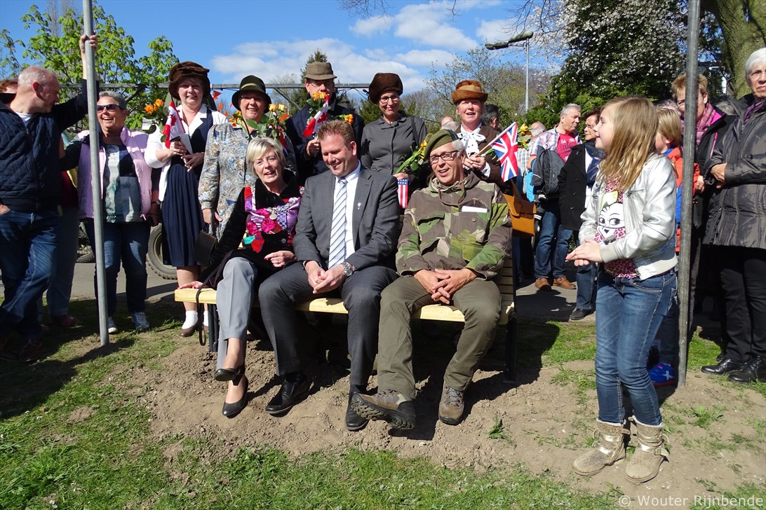 18 april 2015 - Bevrijdingsoptocht komt aan bij de sluis in Dieren. Burgemeester Petra van Wingerden-Boers en wethouder Tjebbe Vugts onthulden een bevrijdingsbank bij de sluis van Dieren.