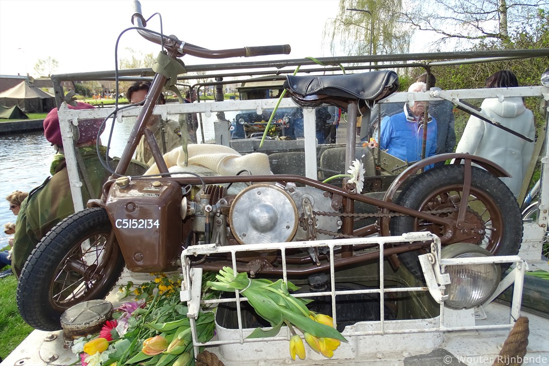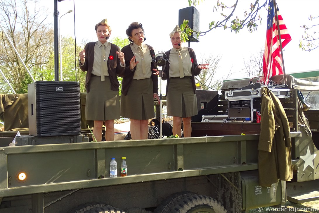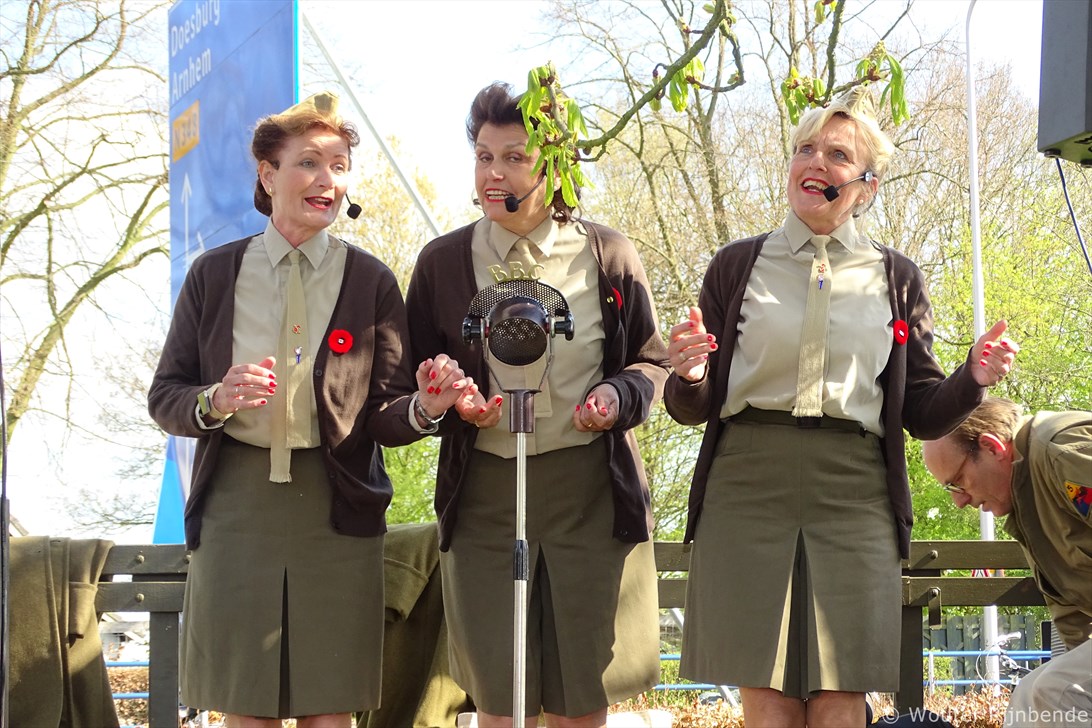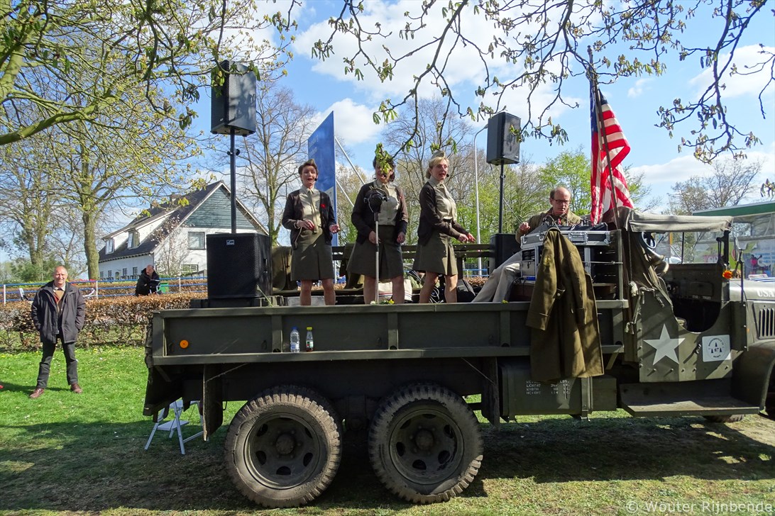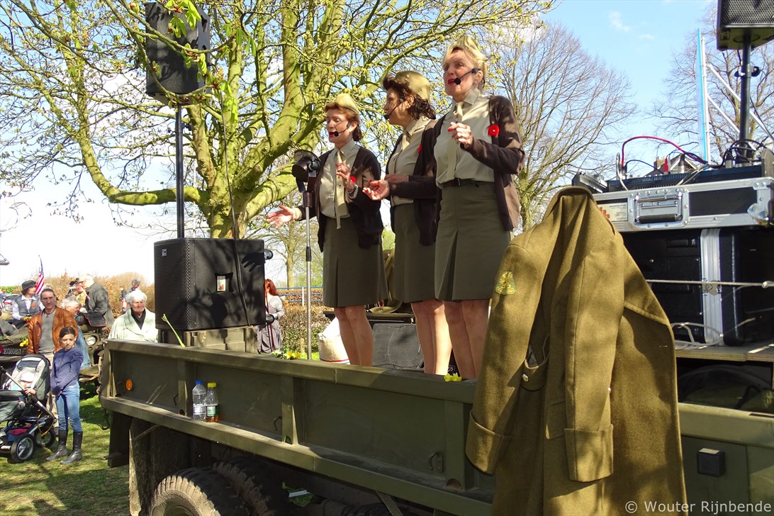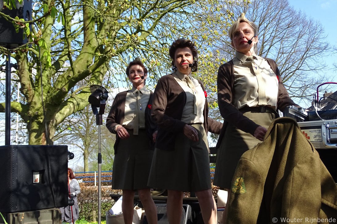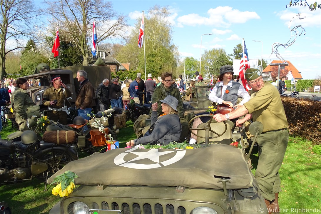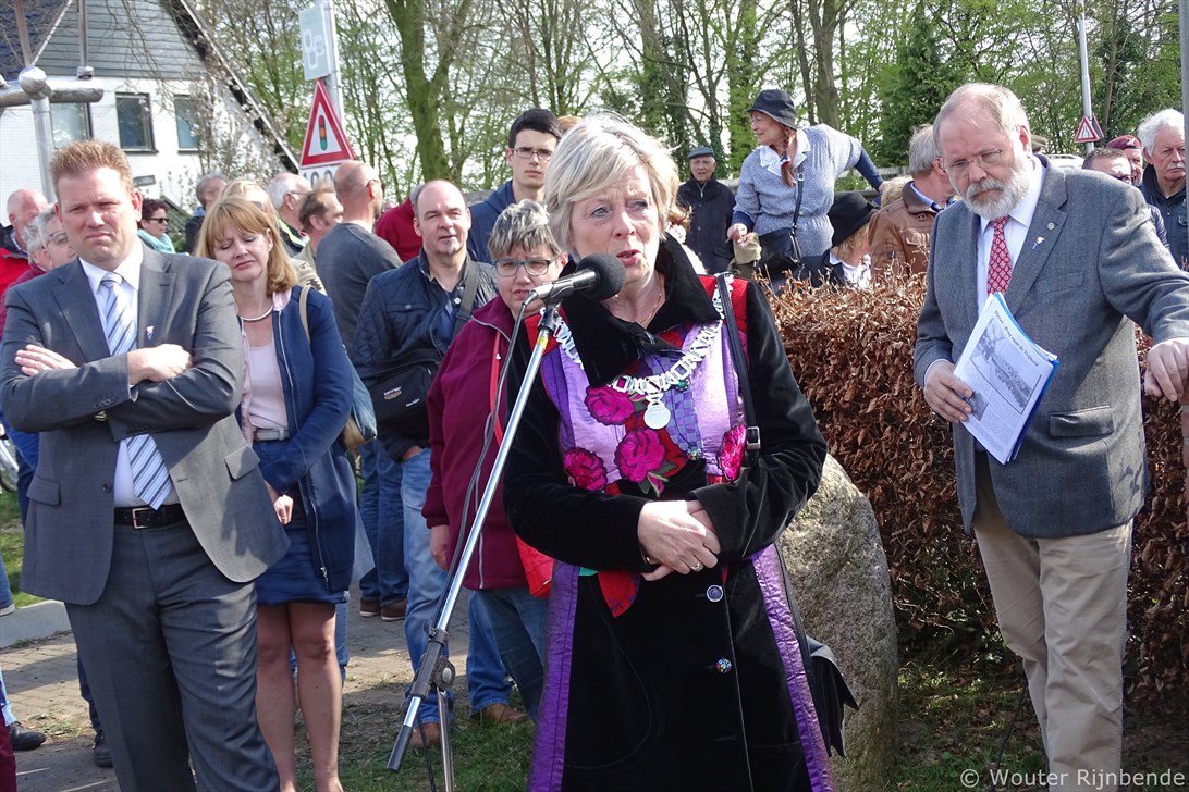 18 april 2015 - Bevrijdingsoptocht komt aan bij de sluis in Dieren. Burgemeester Petra van Wingerden-Boers en wethouder Tjebbe Vugts onthulden een bevrijdingsbank bij de sluis van Dieren.