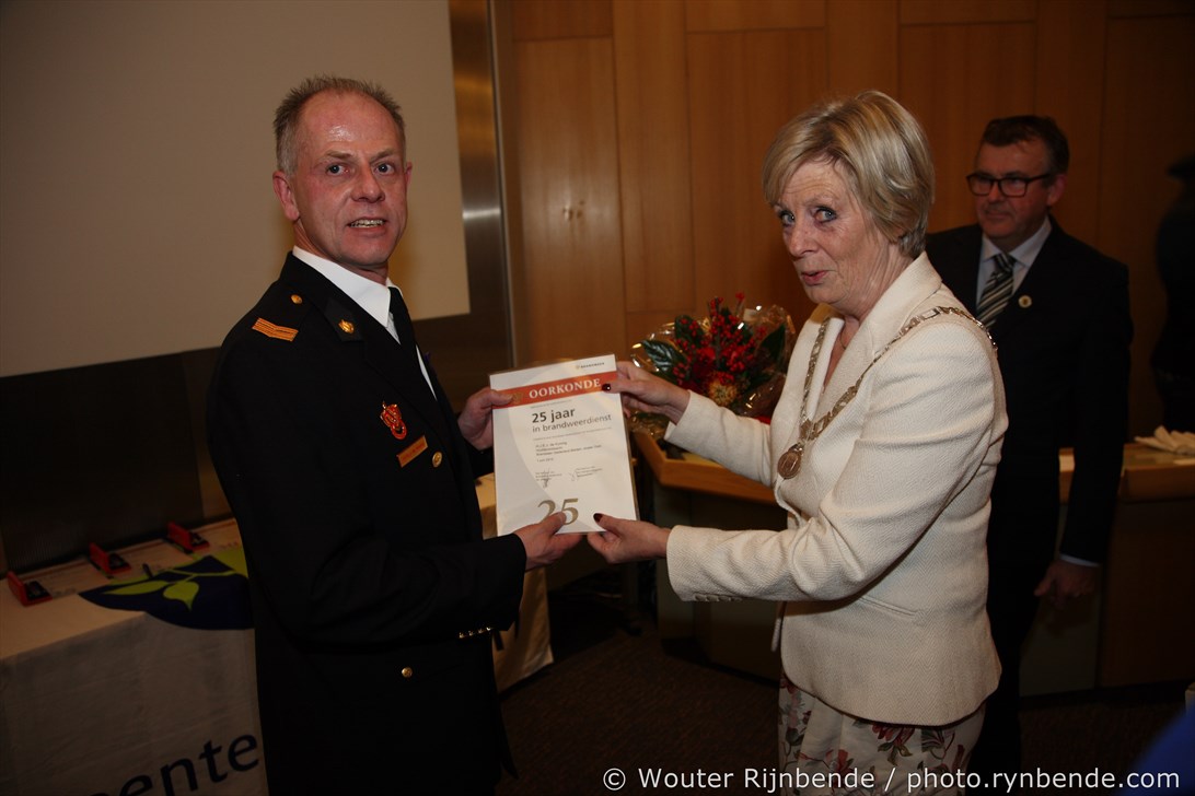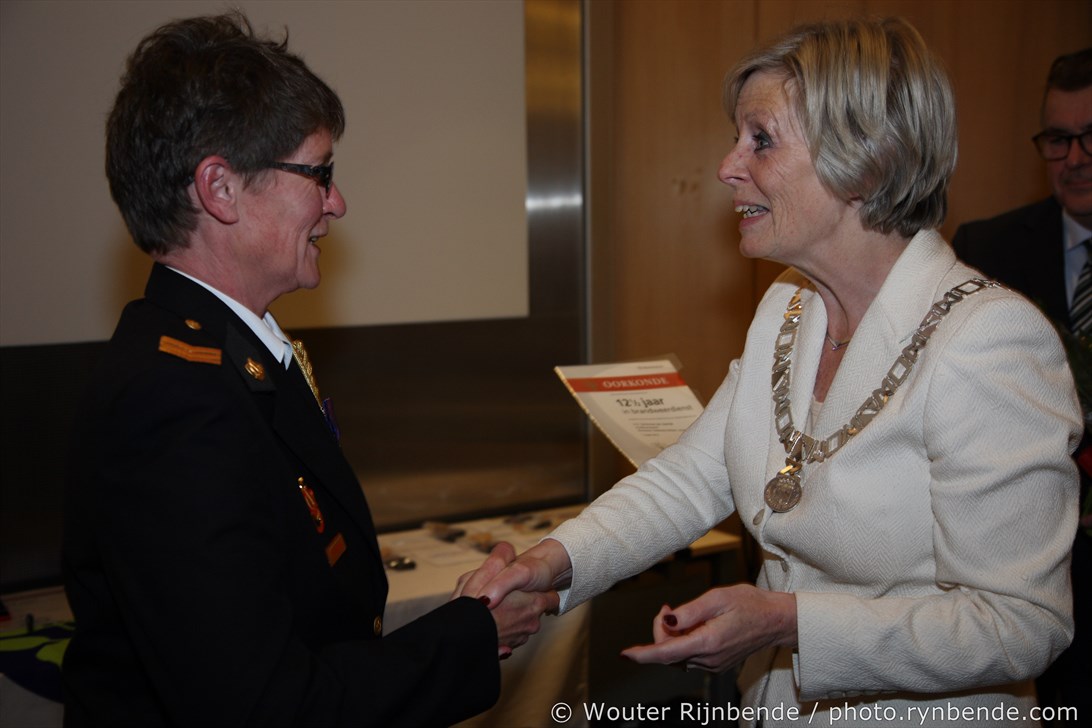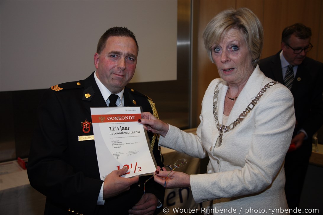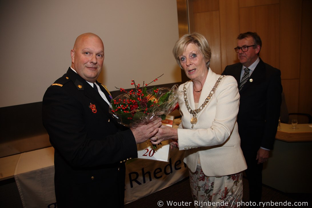 27 november 2015 - In het Gemeentehuis van Rheden werden vrijdagavond 27 november de brandweerjubilarissen gehuldigd. Burgemeester Petra van Wingerden-Boers reikte o.a. de vrijwilligersmedailles uit. De avond werd geopend door mevrouw Marrit Yntema, commandant van Cluster Oost.
