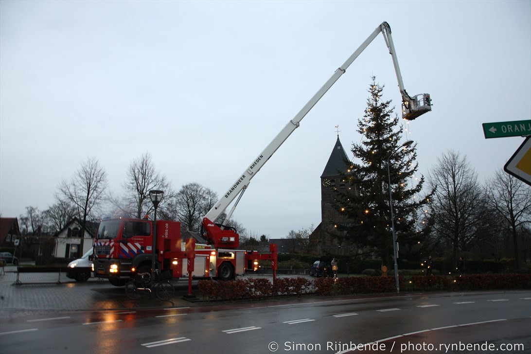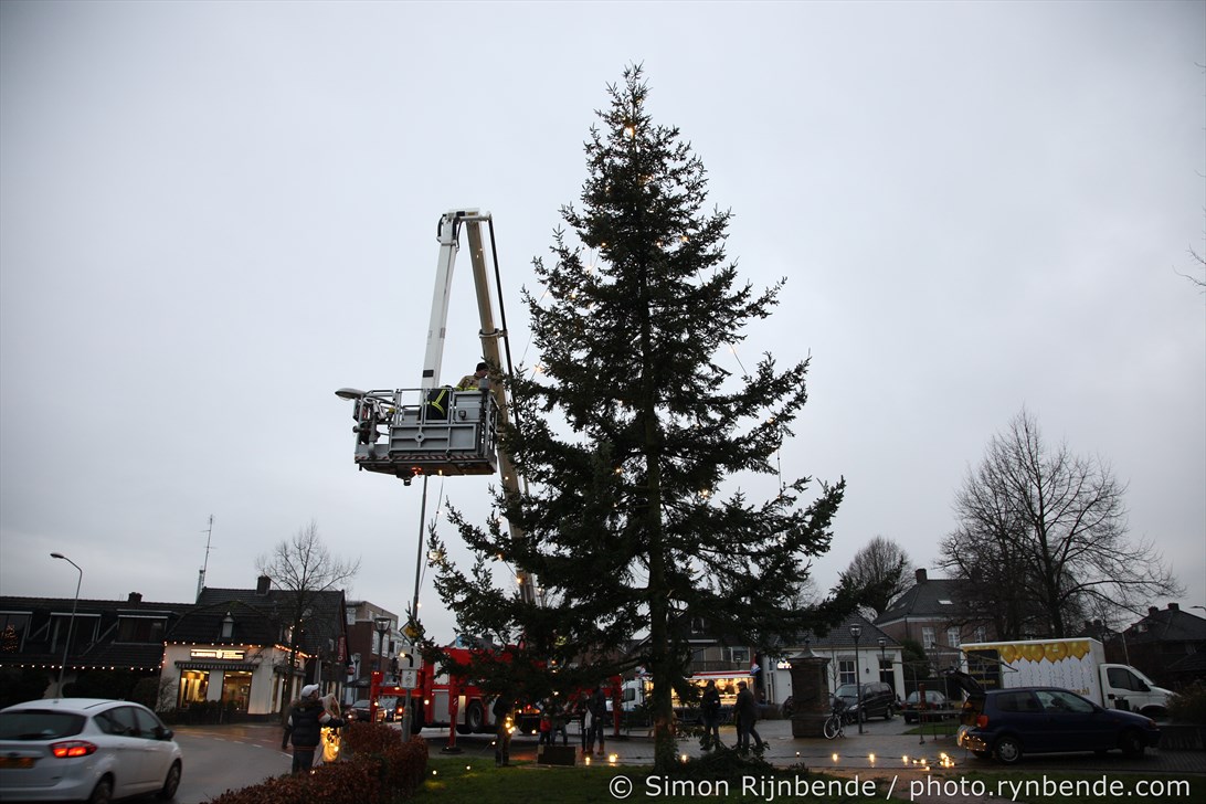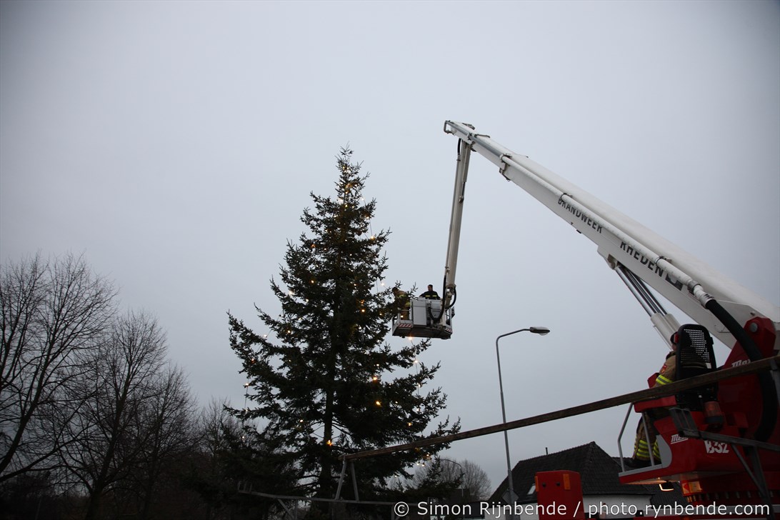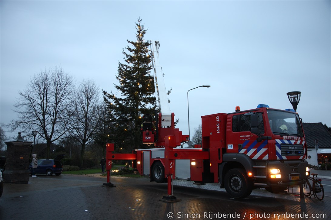 12 december 2015 - De brandweer uit Dieren heeft zaterdagmiddag Stichting Rheden Promotie geholpen met het plaatsen van de lampjes in de kerstboom op het dorpsplein.