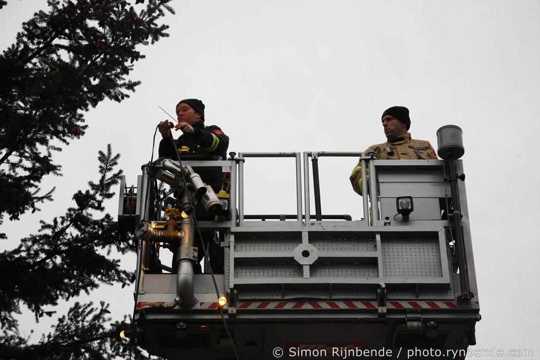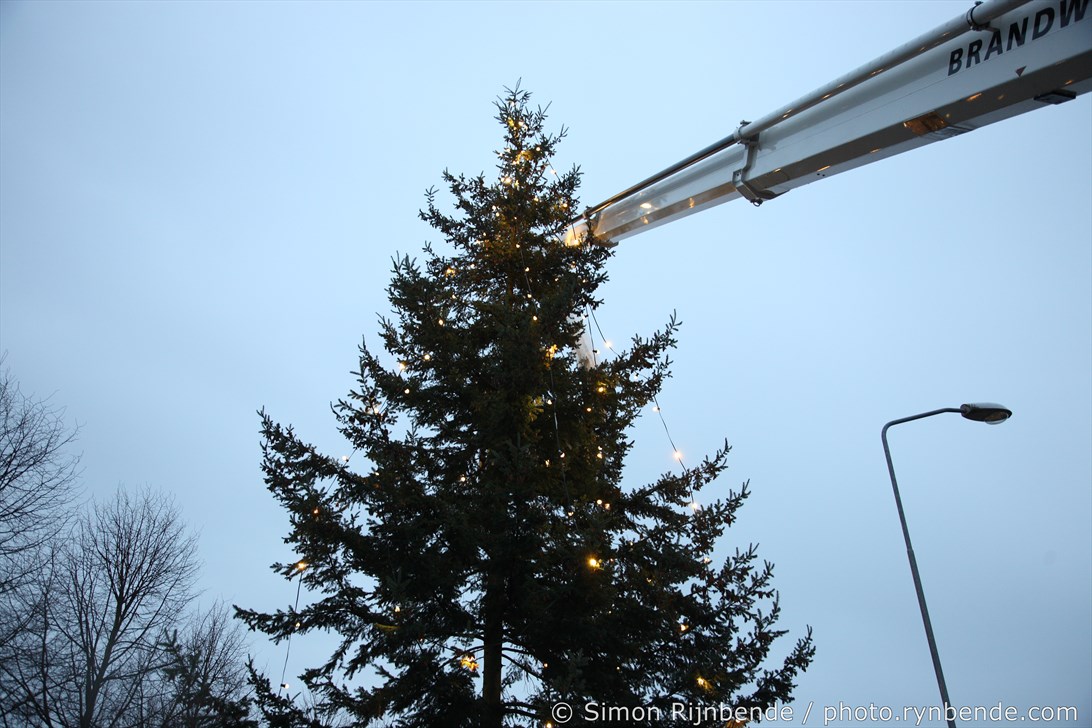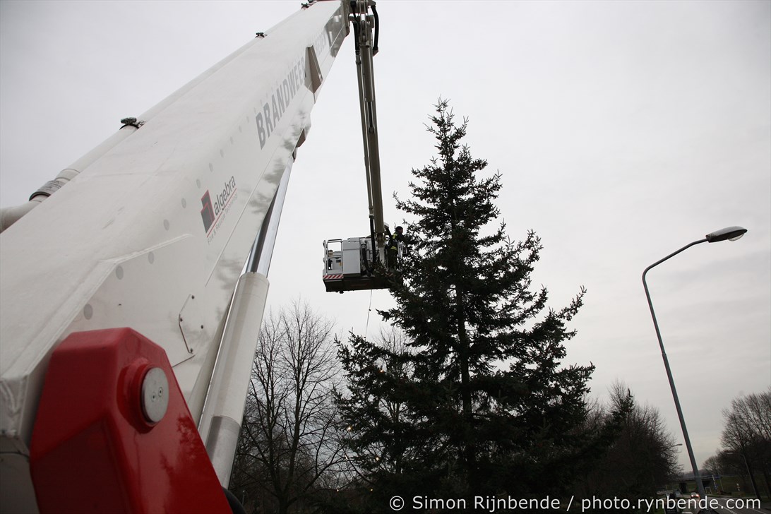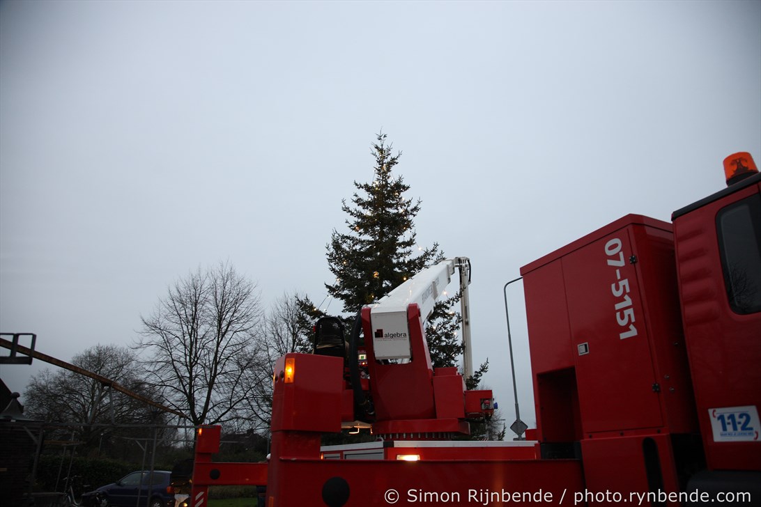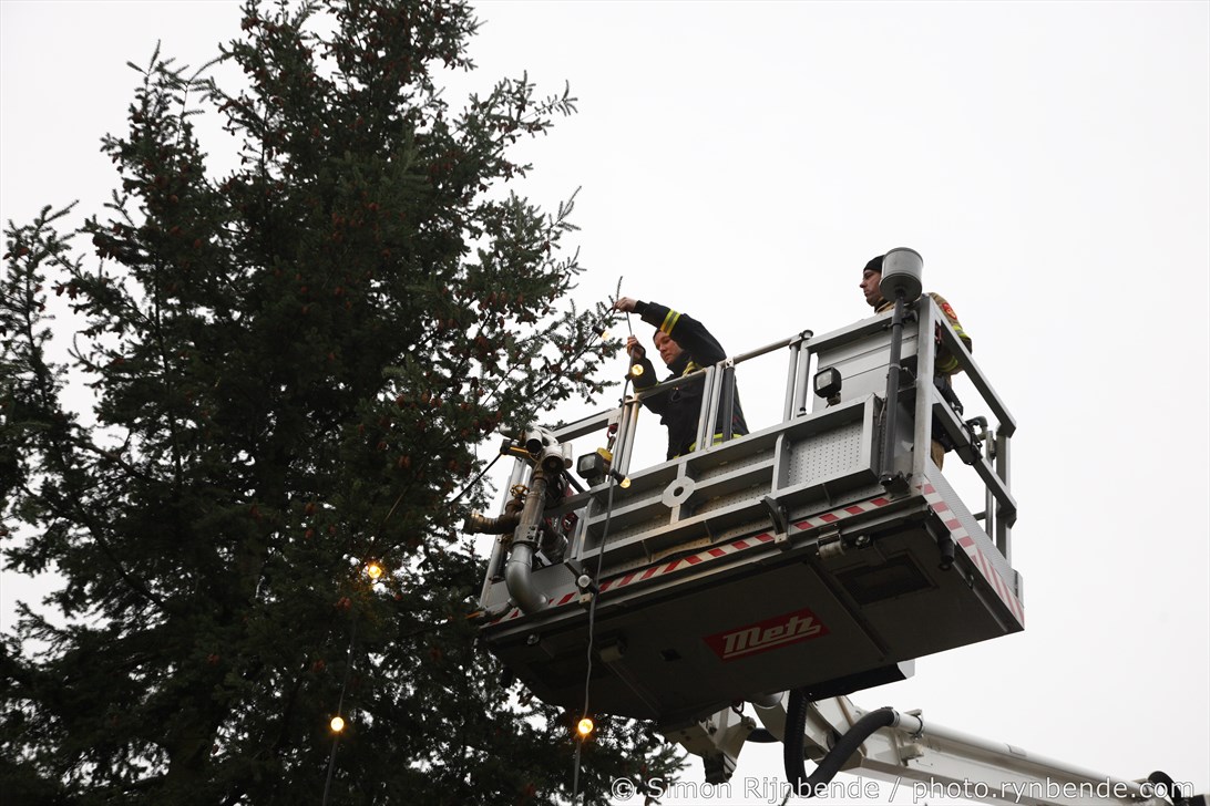 12 december 2015 - De brandweer uit Dieren heeft zaterdagmiddag Stichting Rheden Promotie geholpen met het plaatsen van de lampjes in de kerstboom op het dorpsplein.