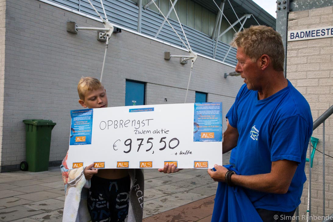 7 juli 2016 - Met zijn initiatief om geld in te zamelen tegen de spierziekte A.L.S. heeft de 11 jarige Jens Daniël donderdagavond maar liefst EUR 975,50 weten in te zamelen. En daar bleef het niet bij, want dat bedrag was exclusief 25 cent voor ieder verkocht kopje koffie, deed een mevrouw die meezwom daar daar nog eens EUR 300,- bij, en kwam de totaalscore uit op maar liefst EUR 1.340,50!